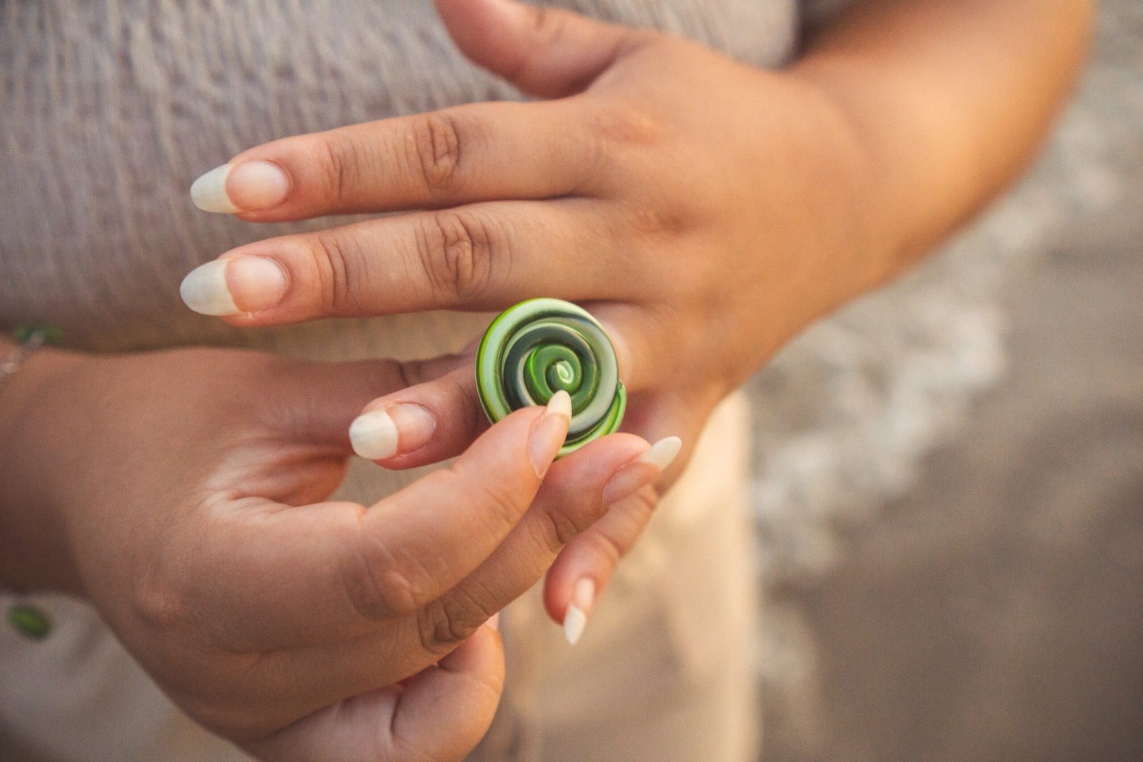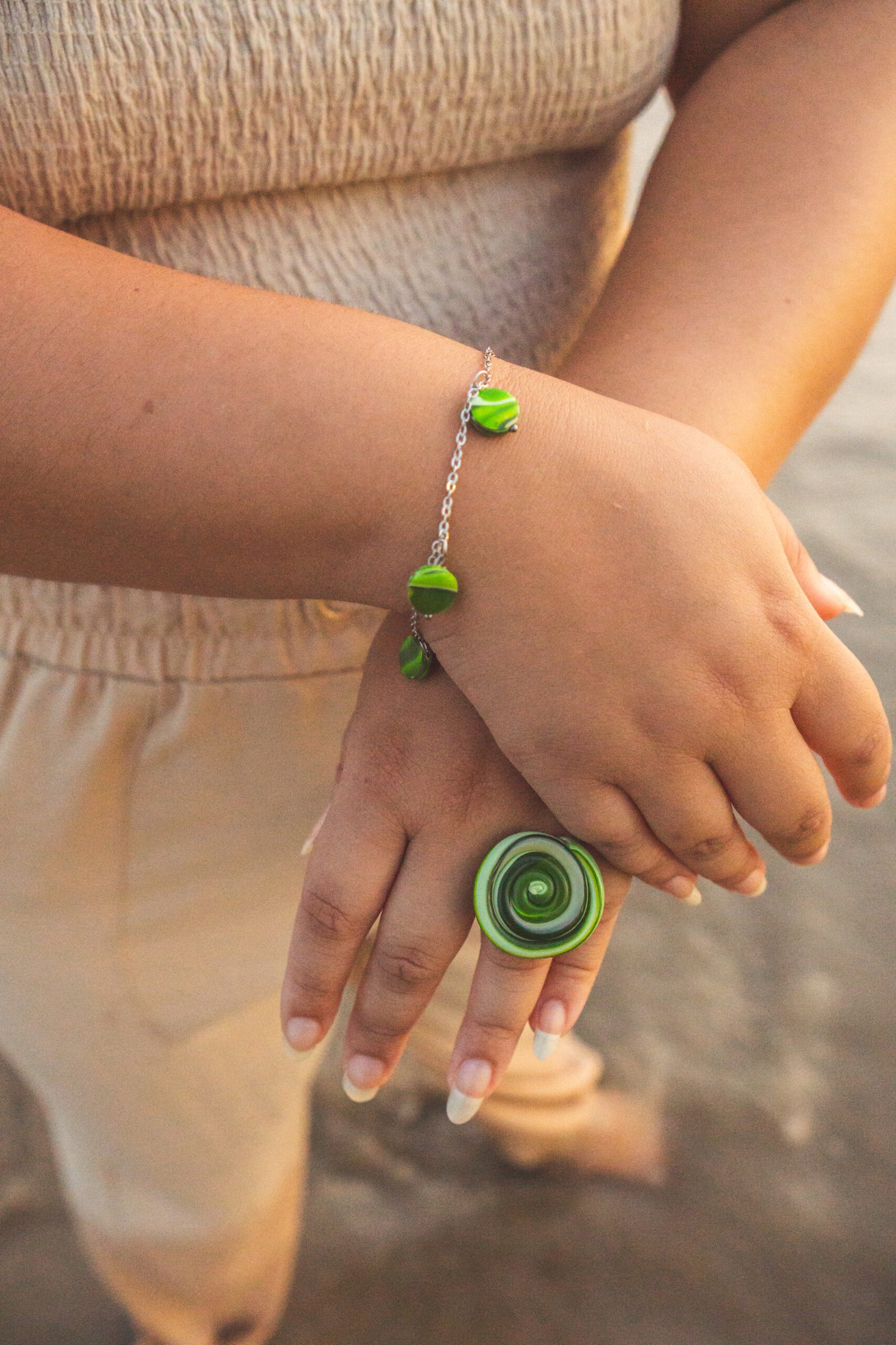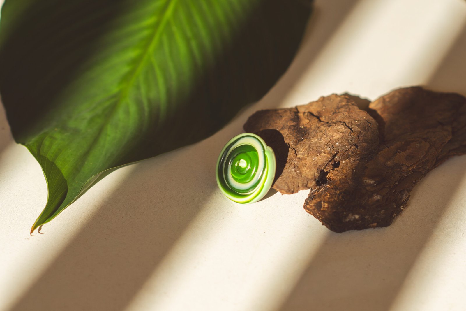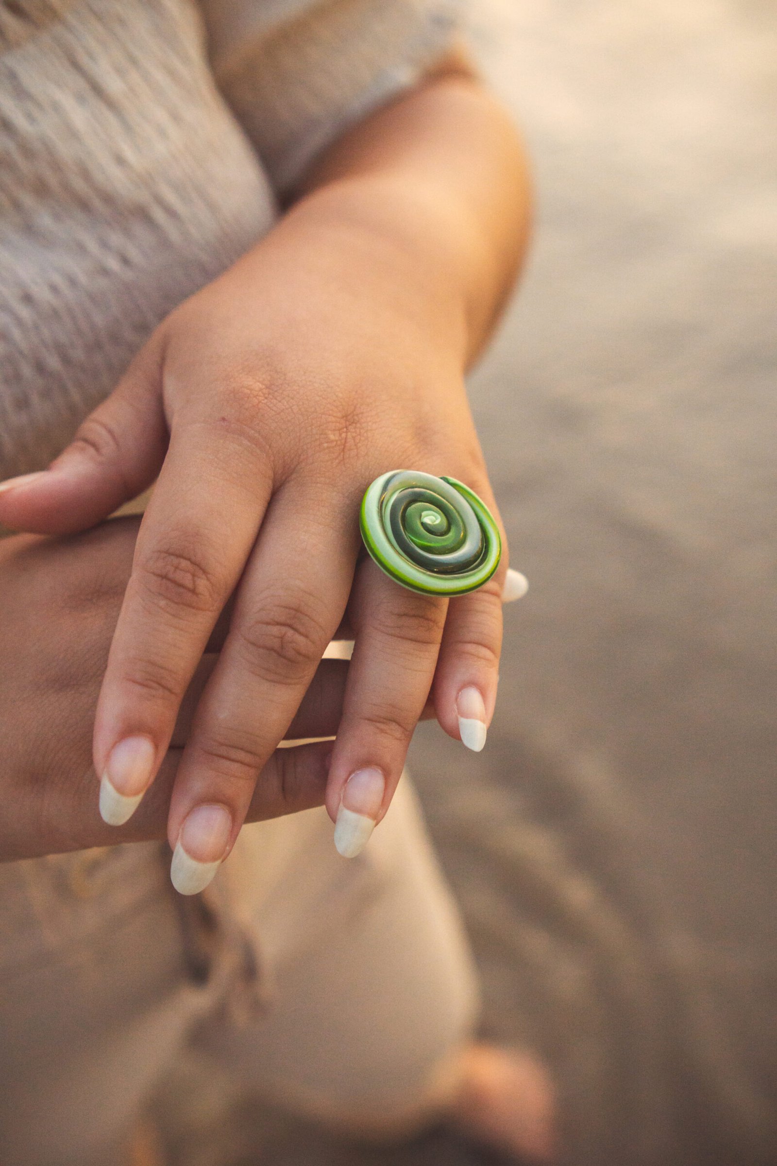 O Anel Gema traz uma pedra orgânica em cerâmica plástica com uma fusão refrescante de tons oliva, hortelã e pistache.