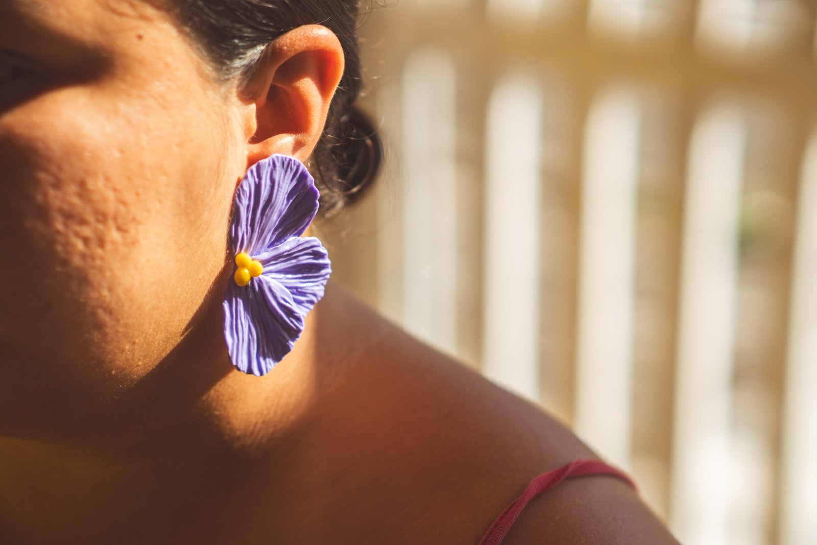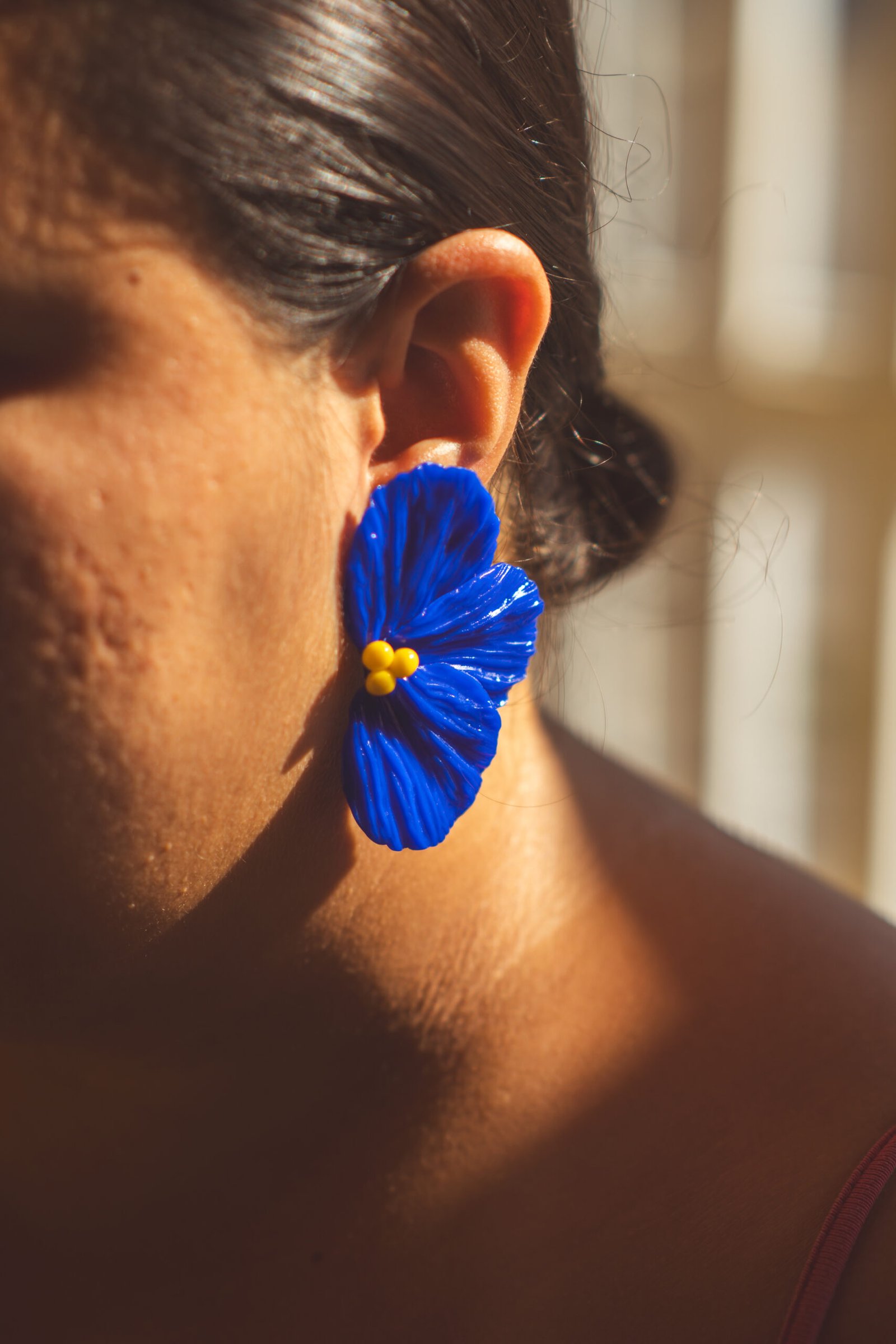 Este brinco grande destaca pétalas amplas e marcantes em cerâmica plástica.