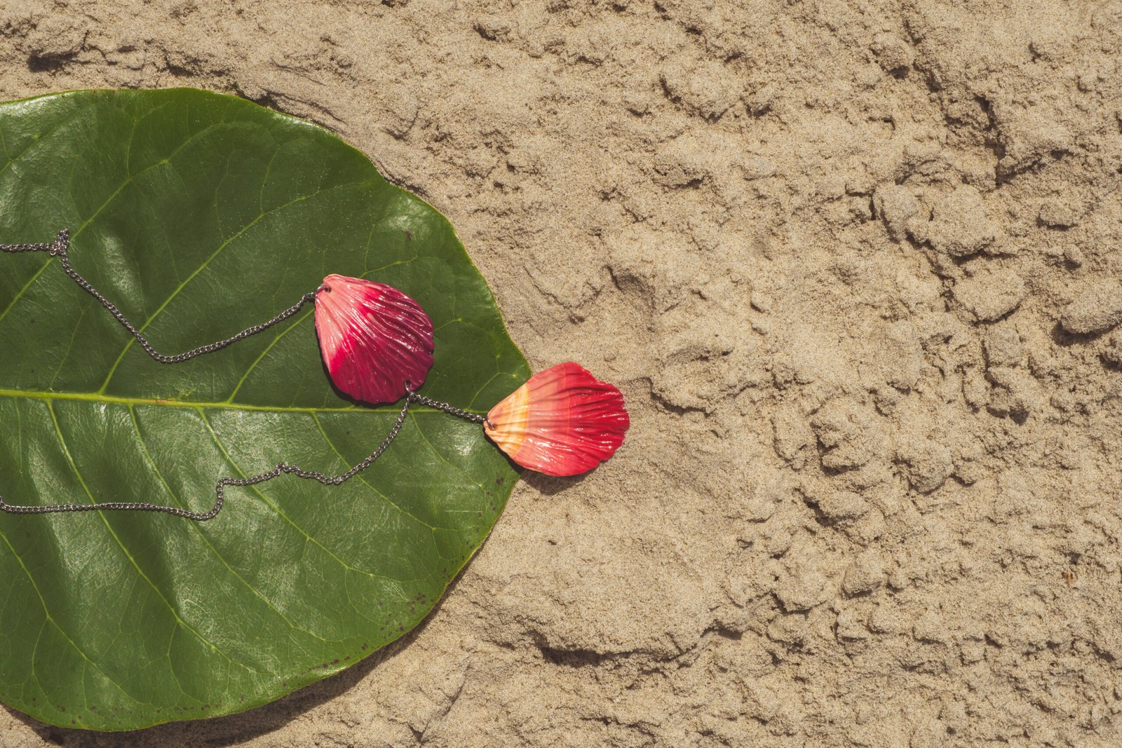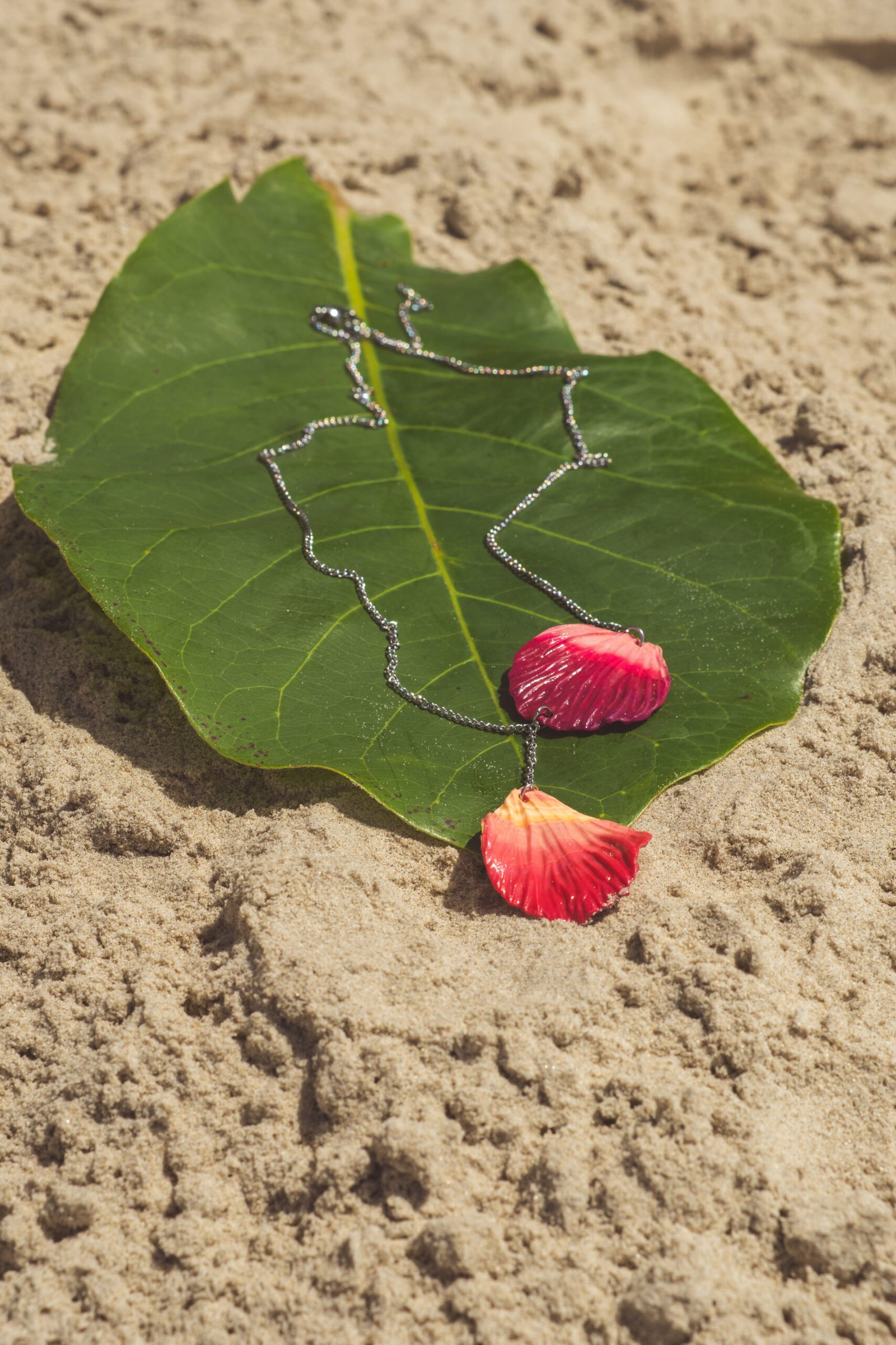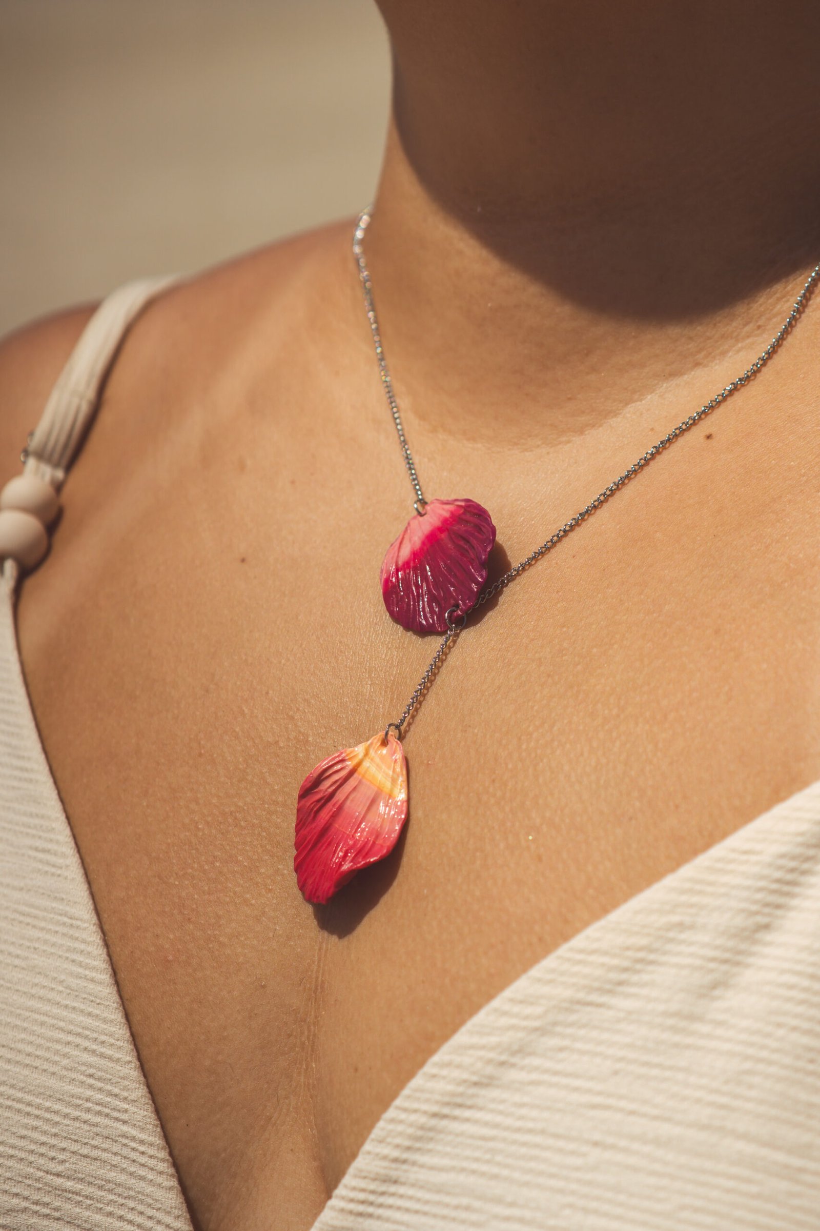 Como pétalas que caem suavemente com o vento, este colar traz pingentes moldados e marmorizados à mão em tons envolventes de orquídea, amaranto, amarelo lírio e branco.