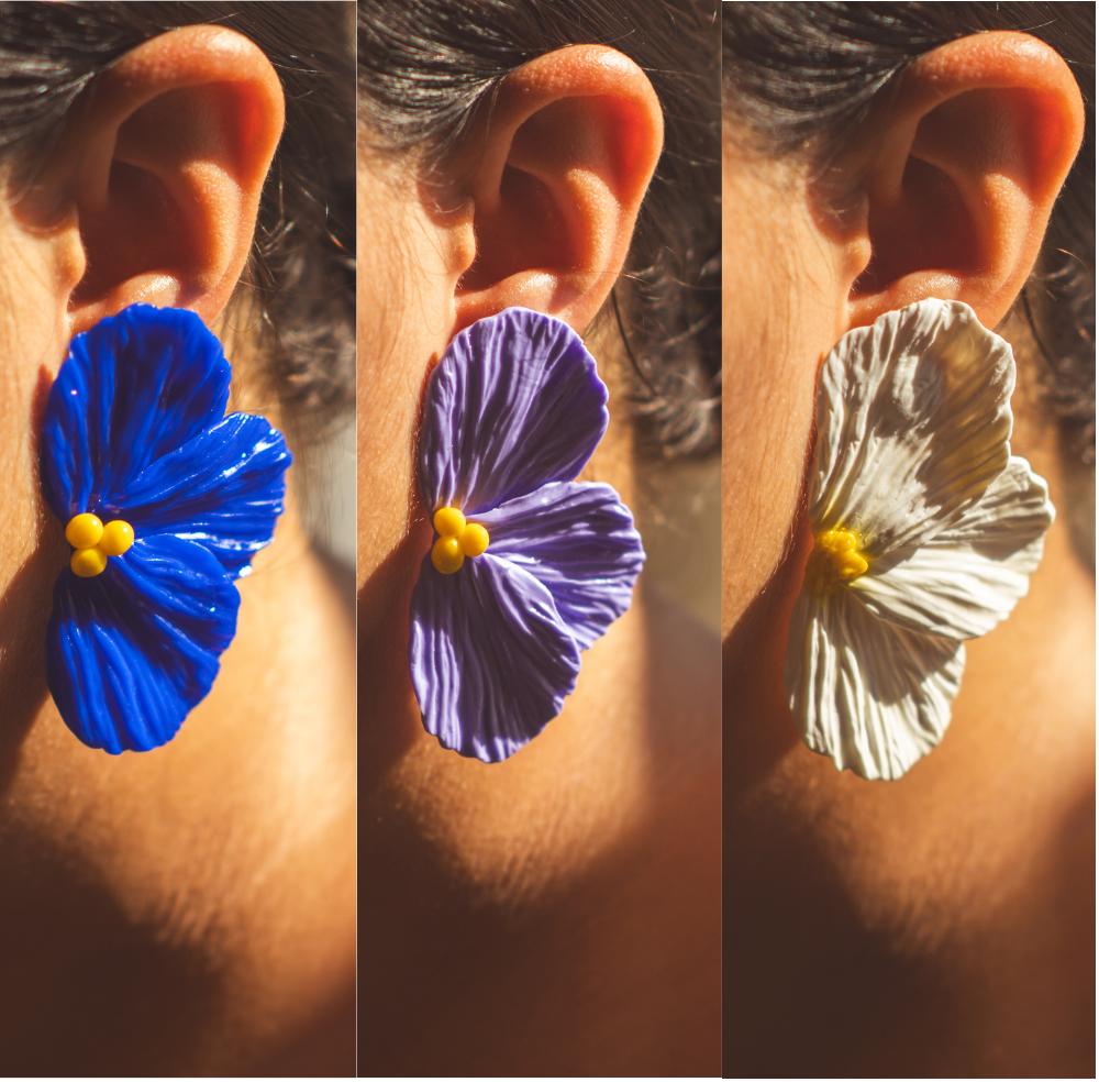 Kit de brincos grandes de pétalas em cerâmica plástica. Cores incluídas: Azul Royal, Hortênsia de Londres ou Branco. Base embutida em aço inoxidável.