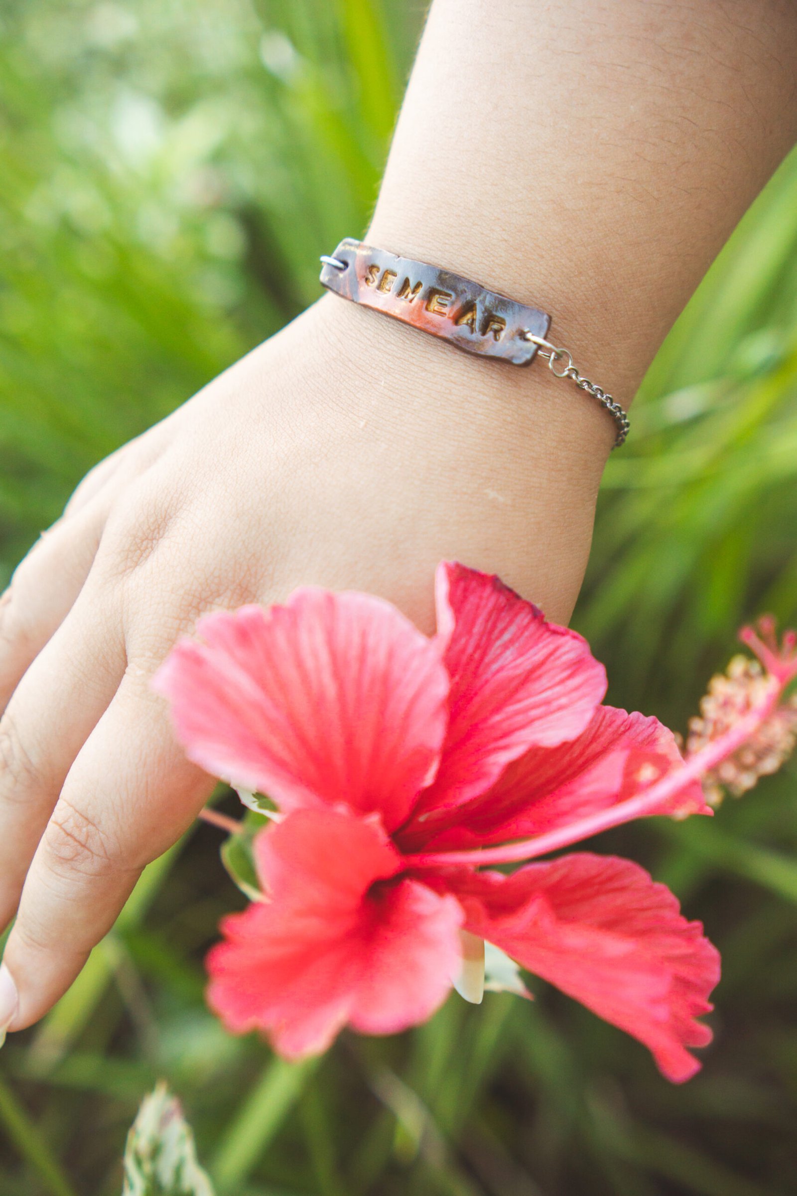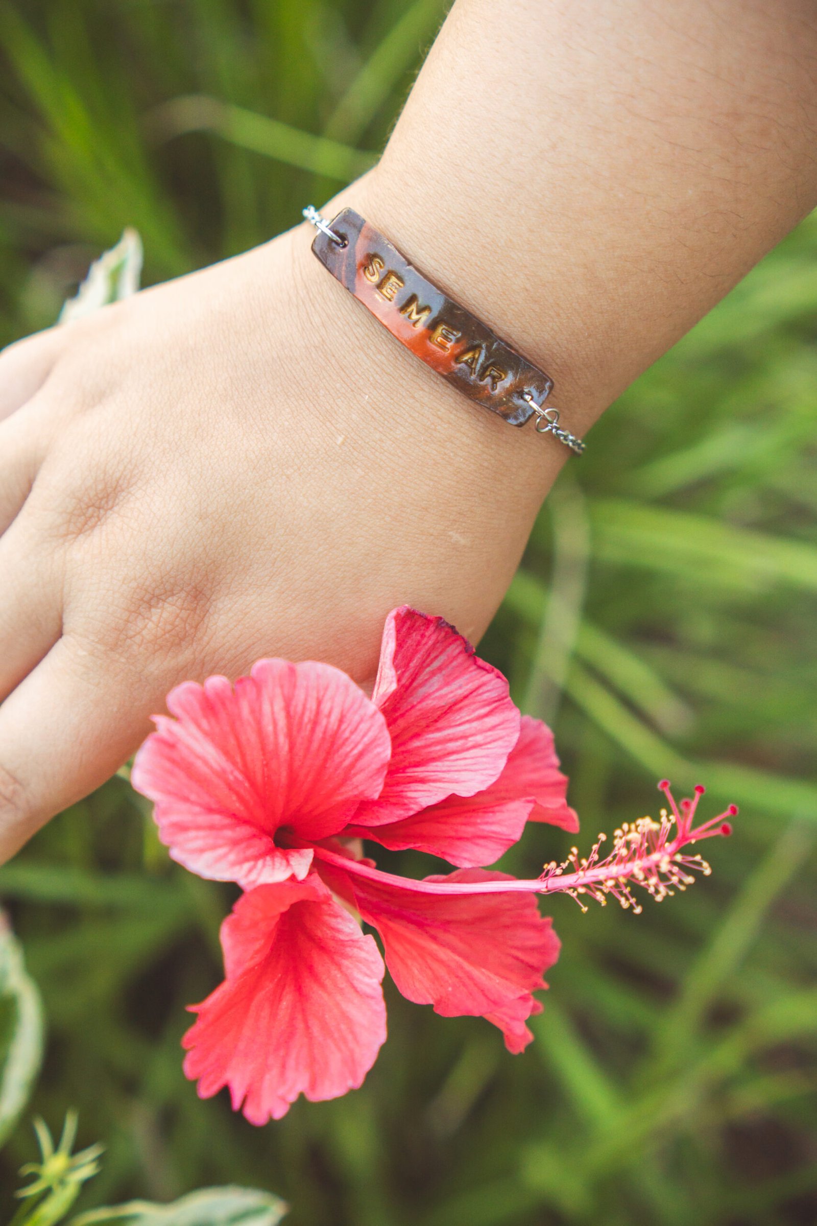 Delicada e cheia de personalidade, esta pulseira destaca um pingente retangular em cerâmica plástica com a palavra “SEMEAR” esculpida em baixo relevo.
