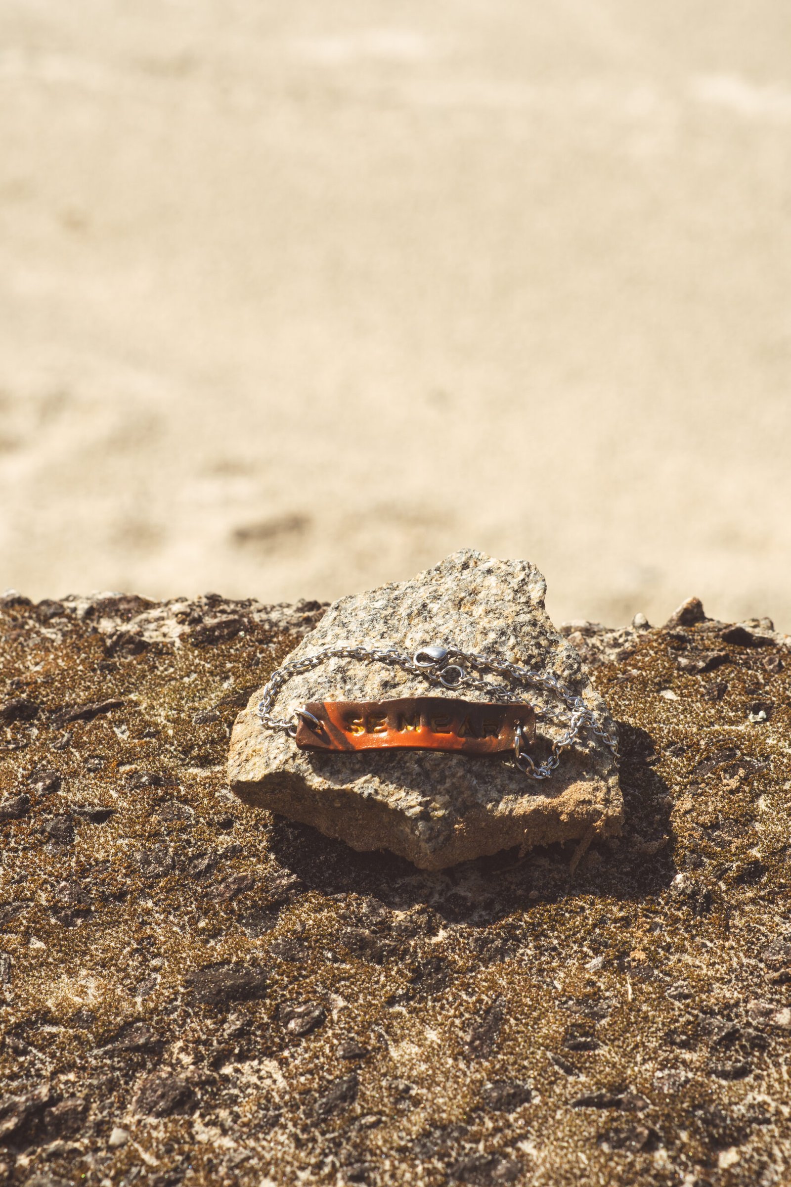 A técnica de marmorização garante um fundo terroso e irreplicável, contrastando perfeitamente com a corrente e a extensora em aço inoxidável.